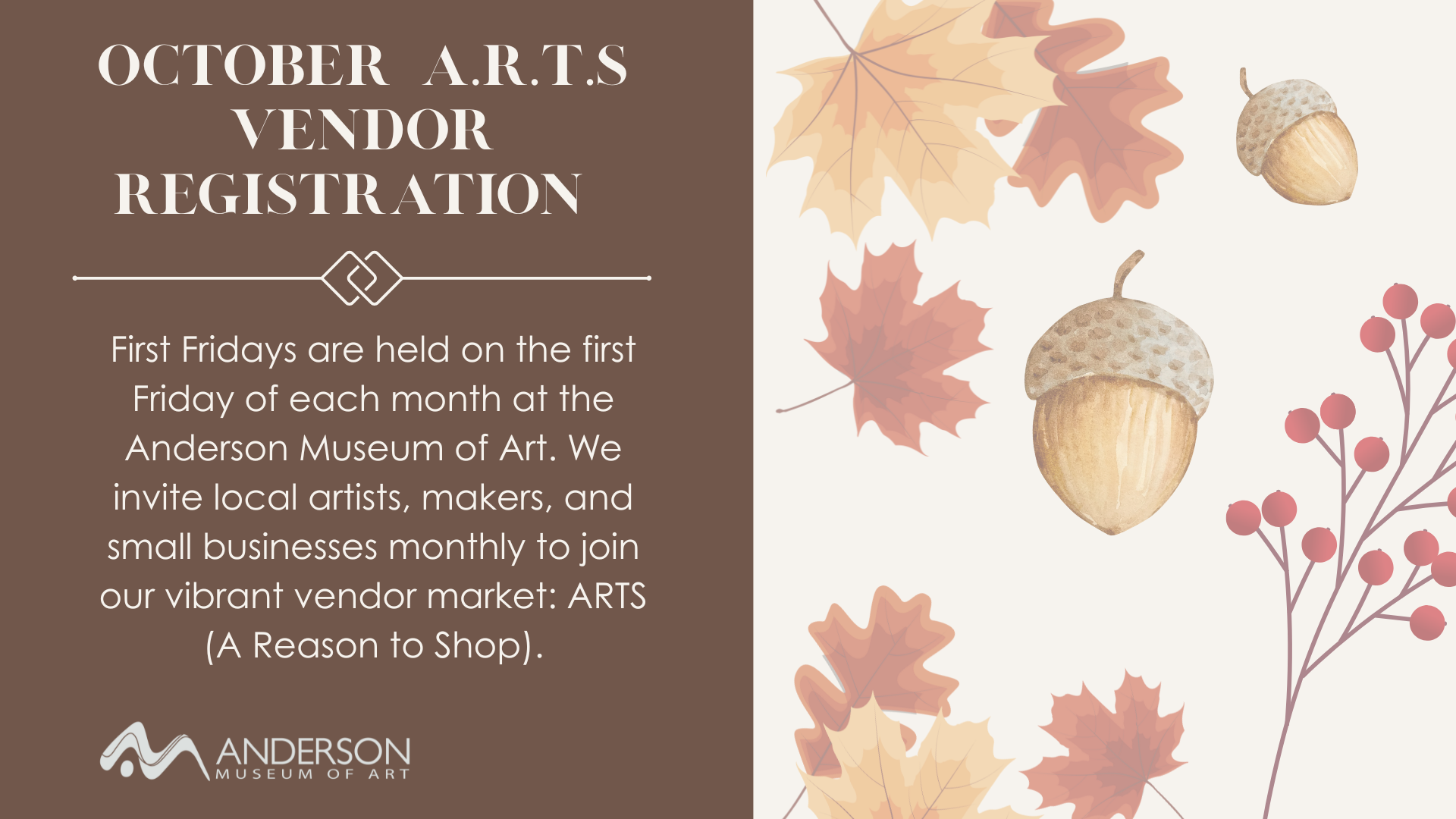 First Fridays are held on the first Friday of each month at the Anderson Museum of Art. We invite local artists, makers, and small businesses monthly to join our vibrant vendor market: ARTS (A Reason to Shop).